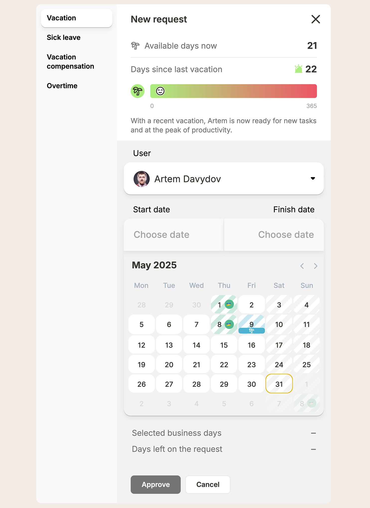 Here is how the vacation request process is organized: users can send vacation requests, which will be sent to users with “Approver” permissions via email and/or Slack.